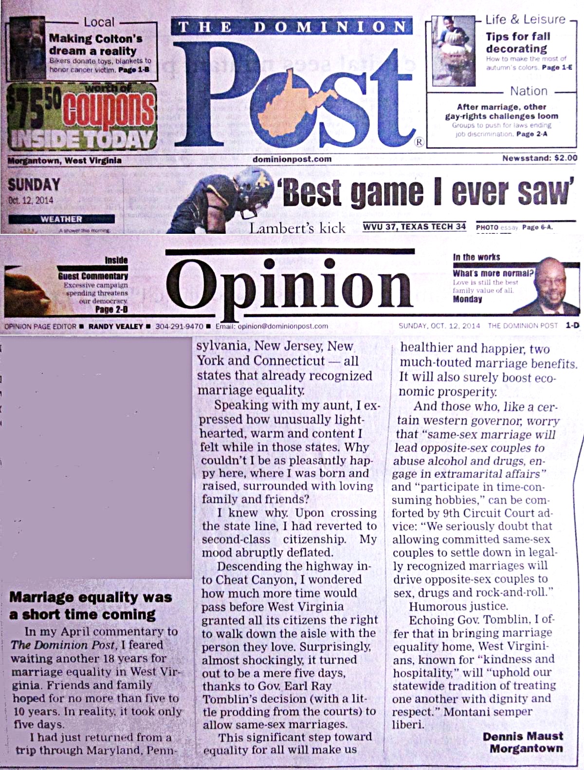 Montani Semper Liberi Redux and On the Road from Morgantown to La Hermandad: two writings quickly published in three days in April 2014. The former, a Dominion Post guest commentary, was published as "Joining union again". The latter, "On the Road from Morgantown to La Hermandad", was a blog post for Firsthand Coop, a labor of love for good friends and good coffee. October 2014 saw me writing an unexpectedly quick follow-up opinion letter to Montani when civil marriage equality arrived in West Virginia.